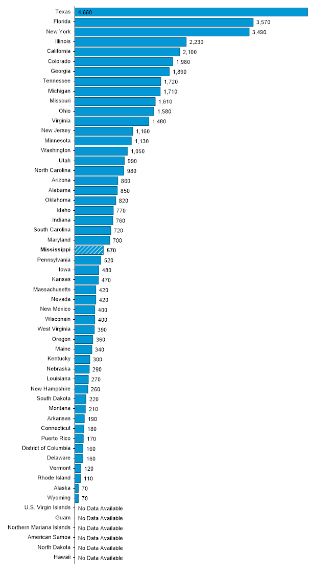 Projected 2032 Employment for Paving, Surfacing, and Tamping Equipment Operators in MISSISSIPPI